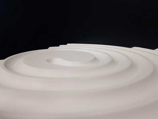 Corian® può essere modellato attraverso la termoformatura, una lavorazione che usa il calore per rendere la materia malleabile e plasmarla in forme tridimensionali caratterizzate da curve morbide. Il massimo della resa si ottiene con il colore Glacier White e in generale con le tinte chiare, accettando un leggero cambio di colore dovuto alla piegatura del materiale, che nel bianco non si nota.