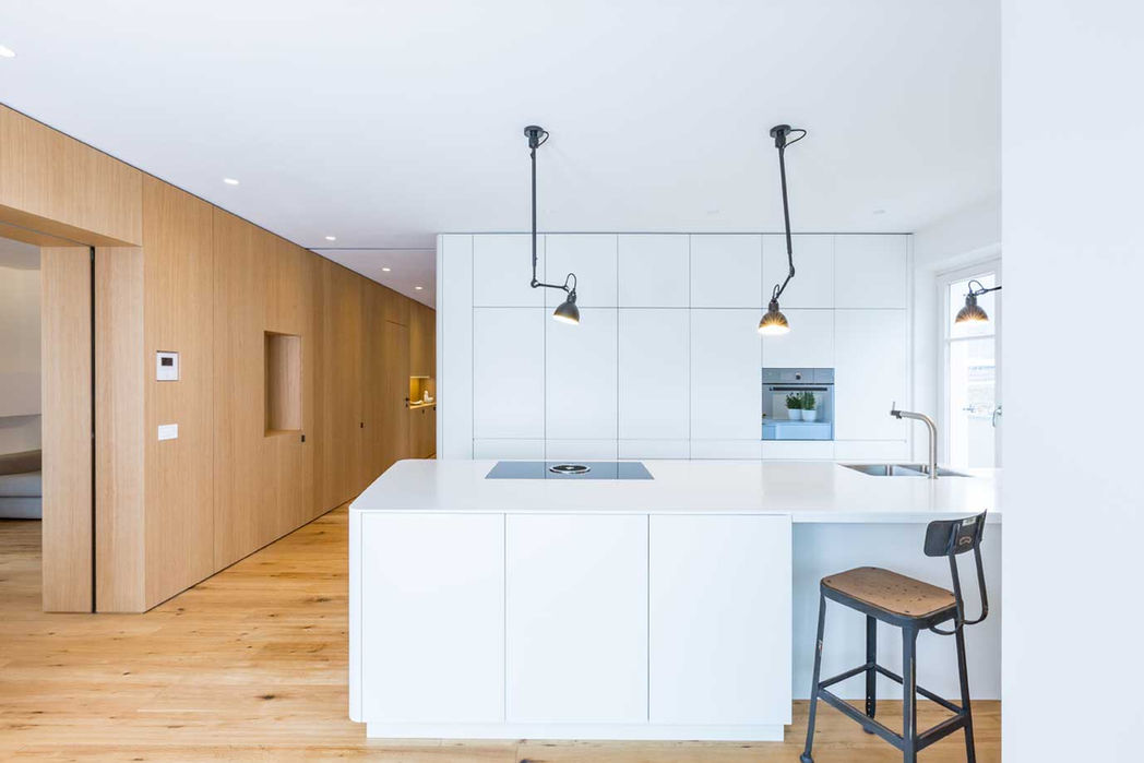 Appartamento PJ è un’abitazione ristrutturata in modo da poter eliminare quasi del tutto le pareti divisorie in muratura, grazie a mobili multifunzione a tutta altezza, in un’alternanza di bianco e legno. L’intero intervento, ideato ed eseguito dalla falegnameria F. Pichler Arredamenti, ha coinvolto Planit nelle realizzazioni su misura in Corian®. In cucina abbiamo curato il piano di lavoro dell’isola, spesso 12 mm, nel quale sono stati incorporati il lavello con vasca in inox, montata sotto top con gocciolatoio scavato inclinato, e il piano cottura a induzione, inserito a filo piano. In bagno, invece, abbiamo rivestito in Corian® Glacier White la vasca da bagno, fornito il piatto doccia Campo, personalizzato in lunghezza e profondità, e preparate le fresature per l’incastro perfetto dei vetri dell’ampio box doccia, che inquadrano la seduta in Corian® interna al vano. Abbiamo, infine, realizzato il piano bagno in Corian® Glacier White con due lavabi integrati Stretch 2.