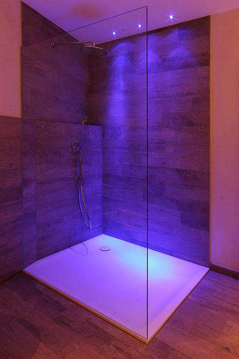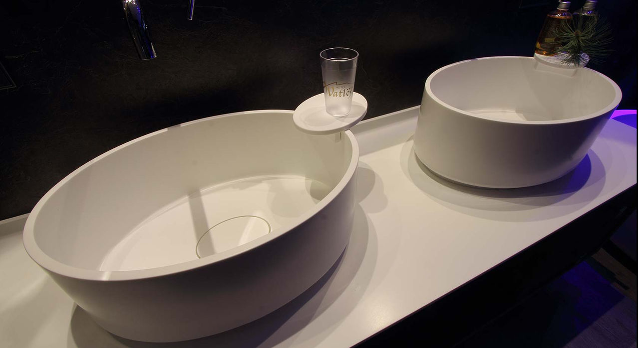 I progetti dell’architetto Christian Kapeller donano una sensazione di pulizia e rigore, e sono sempre caratterizzati dal rispetto dell’ambiente in cui sono immersi. Anche la ristrutturazione dell’Hotel Watles mantiene questa cifra stilistica. Nelle stanze da bagno, il legno rimane l’elemento dominante, ma è affiancato da giochi di luci colorate e dal bianco candido e dall’igiene di Corian®. Il nostro compito è stato quello di fornire una soluzione con piatto doccia Unico su misura, eclettico perché personalizzabile per assecondare qualsiasi spazio, abbinato al lavabo Stella, integrato nel top del mobile bagno. Per le suite, invece, siamo intervenuti con i lavabi soprapiano Triade, caratterizzati dalla forma a catino ovale e completi di pratica mensolina d’appoggio sul bordo.