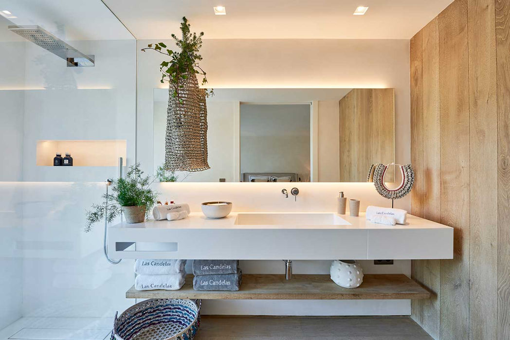 Villa Las Candelas, a Ibiza, vanta una vista strepitosa sull’isola di Formentera e su verdeggianti colline per vacanze da sogno. Spazi aperti, volumi squadrati, alti soffitti e scale rigorose che accompagnano a cinque camere con bagno. Sono questi ultimi gli ambienti in cui Alessia Mainardi ha ideato l’arredo, in parte realizzato da Planit. La designer ha selezionato i nostri piatti doccia in Corian® Glacier White modello Linea, termoformati e antiscivolo, prodotti su misura con montaggio a filo pavimento e con elegante pedana copri piletta removibile. Su suo disegno, abbiamo realizzato gli spessi top bagno con portasciugamano incorporato e cassetti con chiusura a 45° sul bordo del piano. Abbiamo infine fornito i nostri lavabi Libra integrati sotto top, caratterizzati da angoli stondati e lunghezza e larghezza personalizzati, e i lavabi rotondi Concave 1 e ovali Concave2, in appoggio su un anello di sostegno. Le proposte sono completate da rubinetteria a muro, mentre tutti gli elementi bagno sono realizzati in Corian® Glacier White.